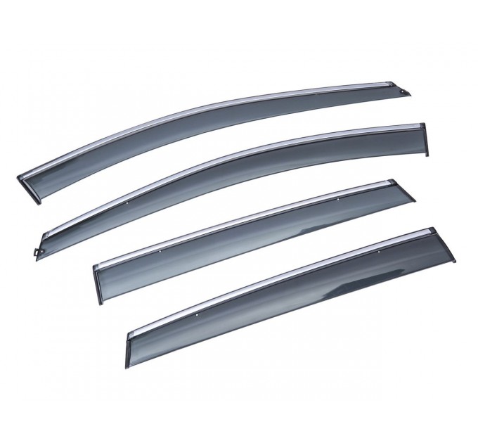 Прозрачные дефлекторы изготовлены из высококачественного акрила с хромированной вставкой. Крепятся на двухсторонний скотч, и дополнительно фиксируются тремя металлическими фиксаторами. Легко устанавливаются и идеально прилегает к рамки двери.